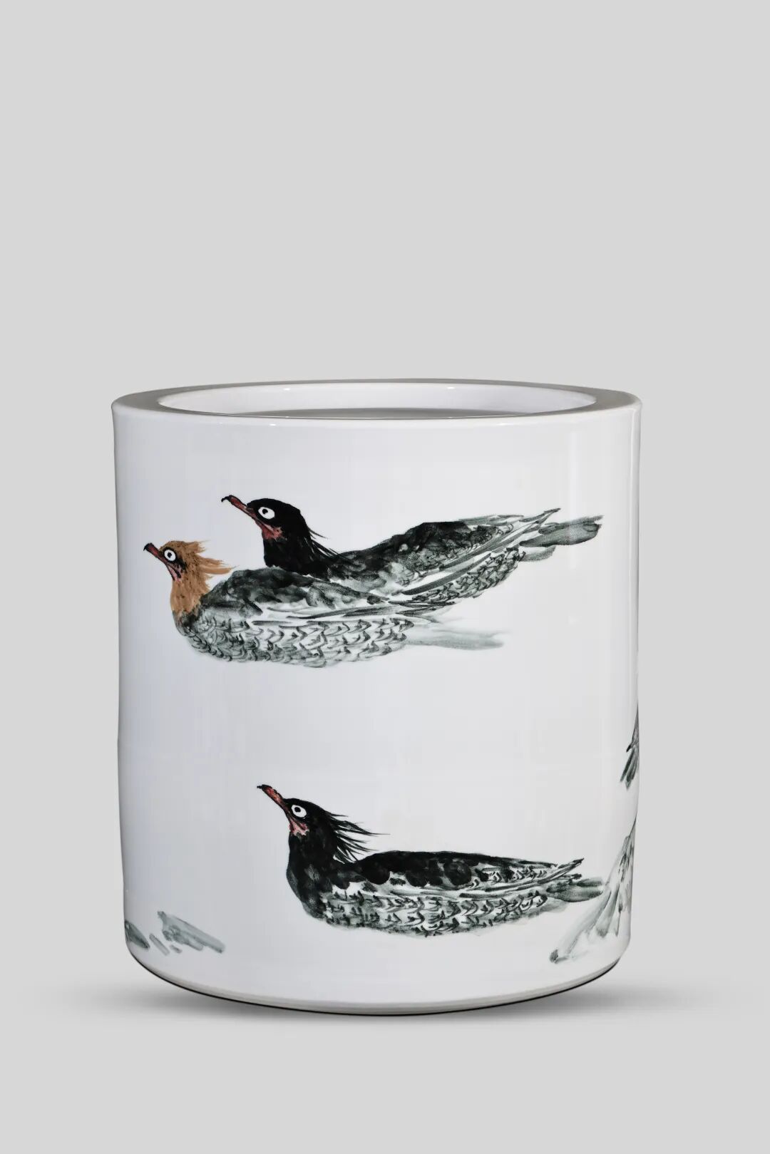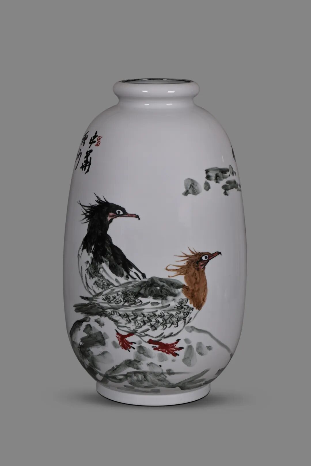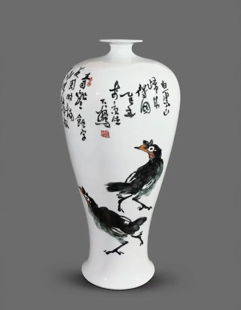 如大翁的《中华秋沙鸭》作品,水鸟的灵动姿态是写生时的精准捕捉,而釉色的自然流淌又为画面添了几分浑然天成的意趣;《白云山里写白云》作品,山间云雾的缥缈意境,在瓷与火的交融中展现得淋漓尽致。